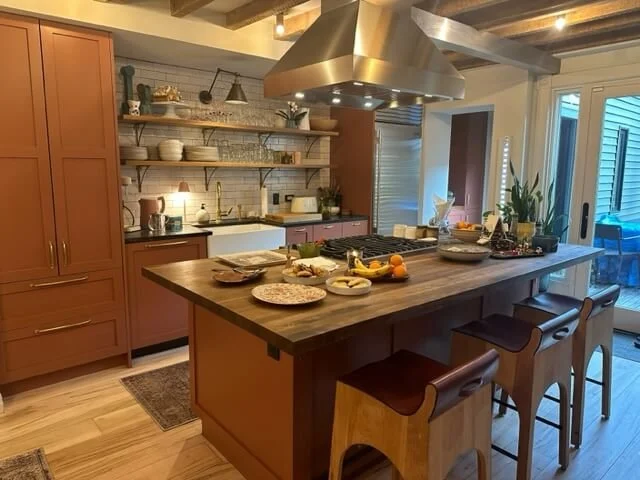 We were thrilled to be involved with our professional cabinet refinishing experience and techniques to apply Benjamin Moore’s California Redwood. A satin paint was selected for its subtle sheen and easy-to-clean characteristics. The kitchen evokes all the contemporary vibes of a modern space while embracing rural elements in the farmhouse sink, earthy redwood color cabinets and natural wood shelving and island counter top. It is one of the warmest, most inviting kitchens to which we have had the privilege of contributing.