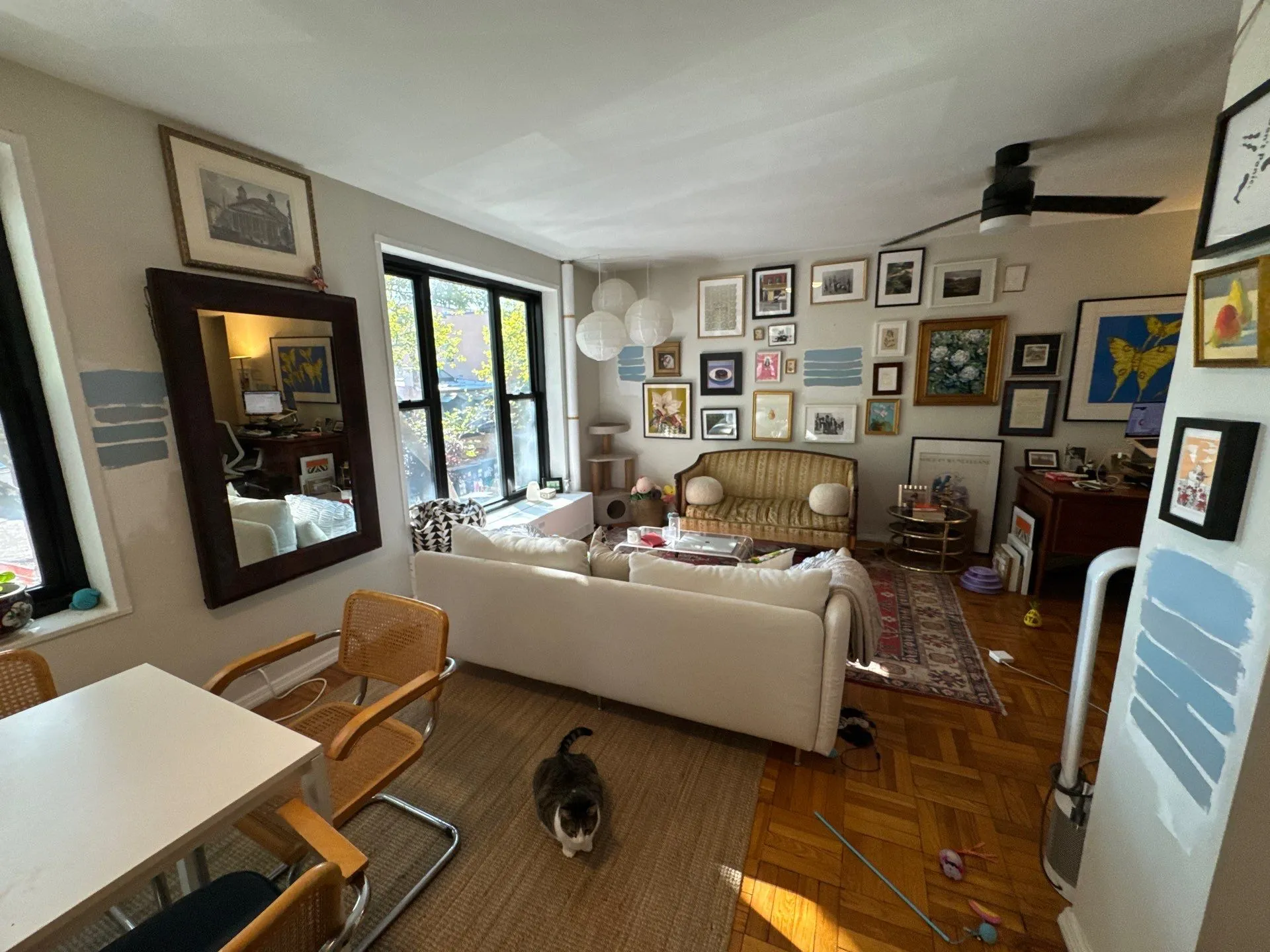 We recently installed molding in a lovely brick Brooklyn condo building, starting with protecting the furnishings in the room and bringing in the trim pieces. It’s quite an exercise in measuring accurately, cutting cleanly, mitering corners, installing with nary a wall or screw showing, then priming and painting without getting any paint on the adjacent ceiling or walls.